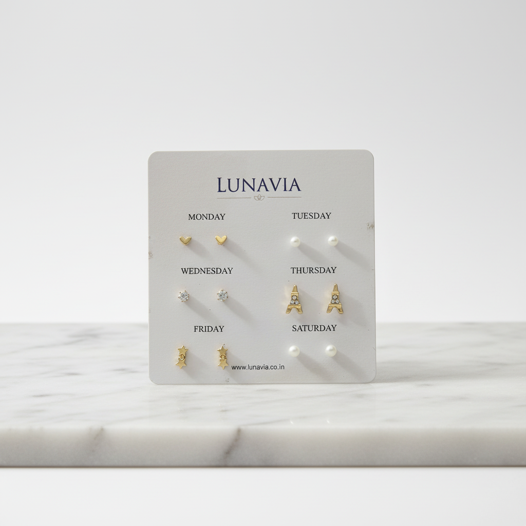 Upgrade your daily style with Lunavia’s 6-pair weekly earring set. Featuring chic gold hearts, pearls, stars, and Eiffel Tower designs, this curated collection blends elegance and playfulness — perfect for every day of the week, from work to weekend outings.