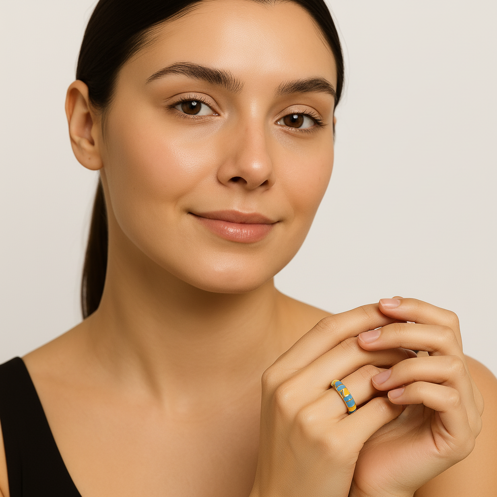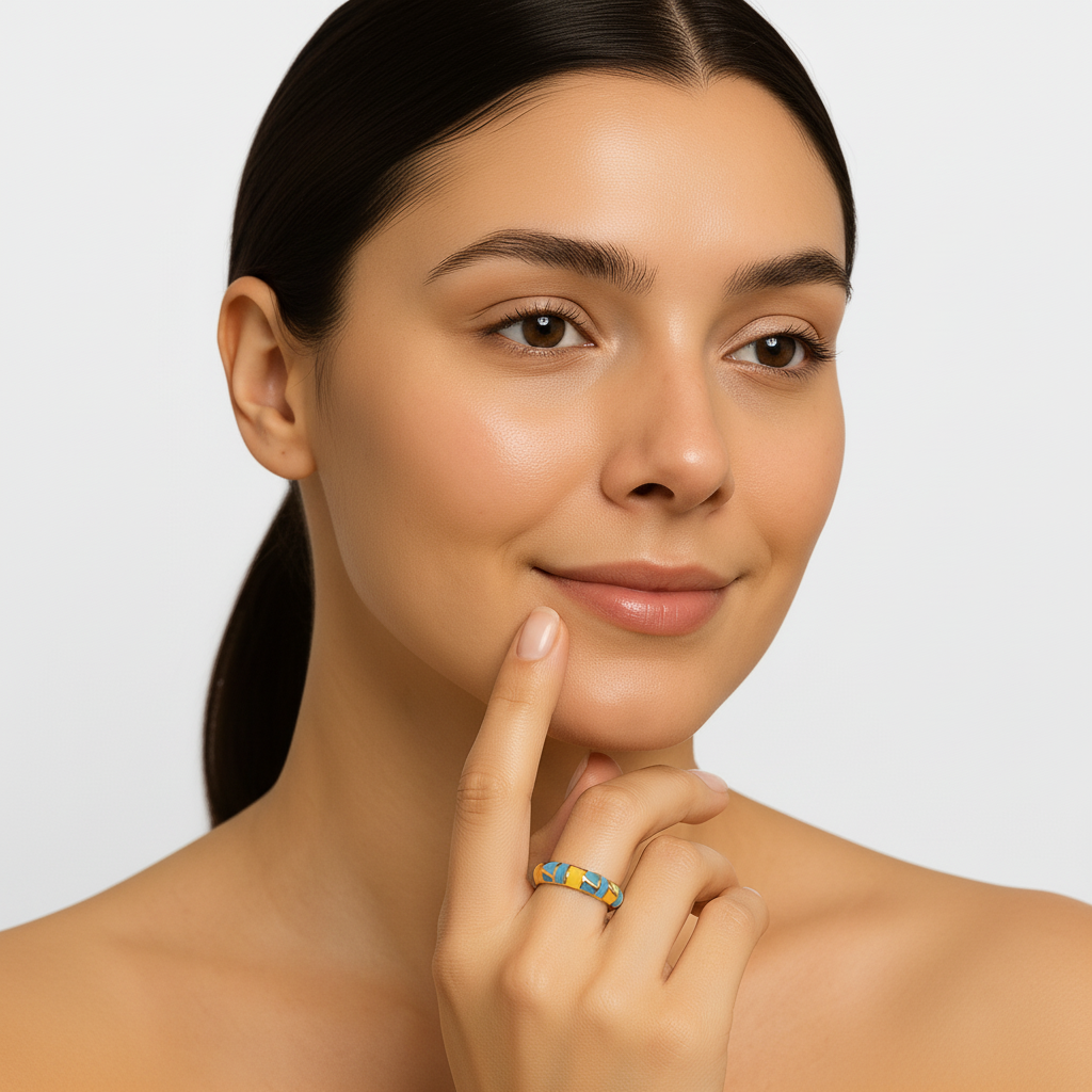 Contemporary and elegant — this blue enamel and gold adjustable ring features a geometric mosaic design that adds a modern artistic flair. A Lunavia signature piece blending vibrant color, fine craftsmanship, and timeless sophistication for everyday luxury.