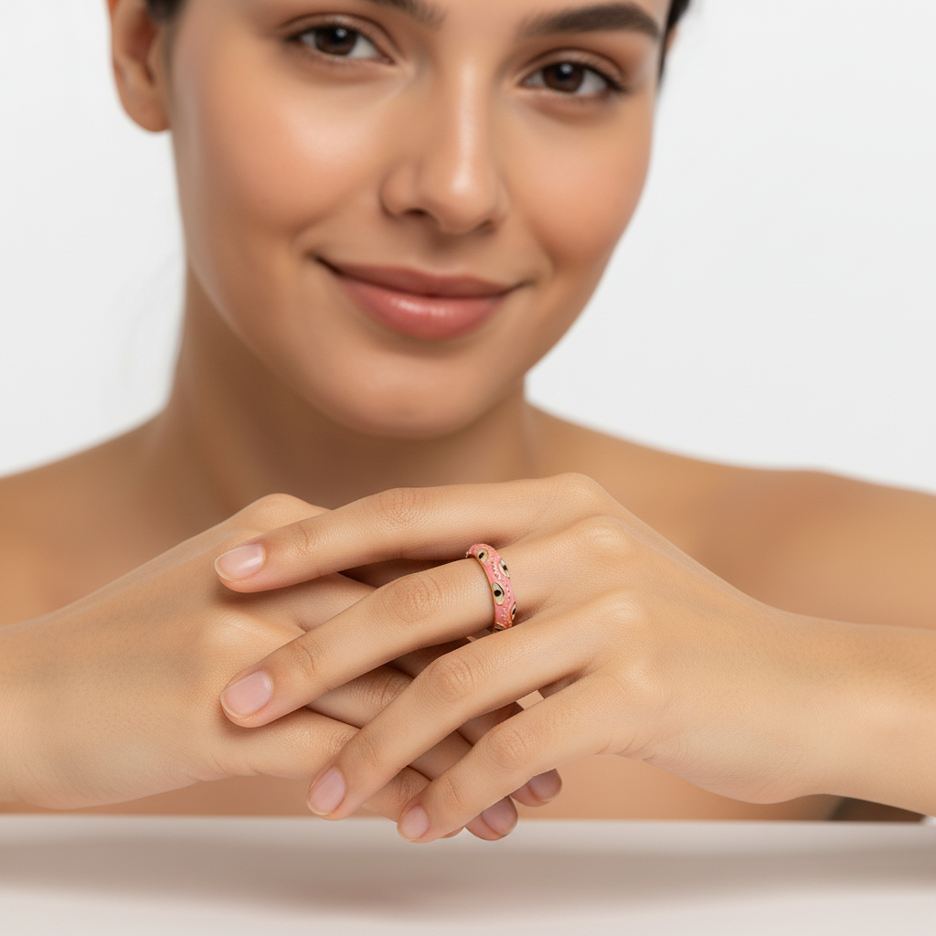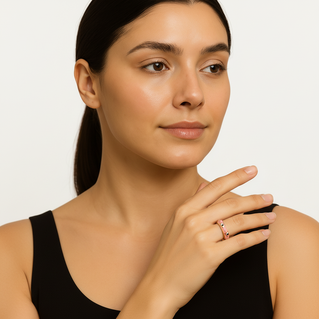 Elegant and symbolic — this coral pink enamel and gold adjustable ring features a handcrafted evil-eye motif for beauty and protection. A Lunavia signature piece that blends modern color with timeless luxury, perfect for effortless everyday elegance.