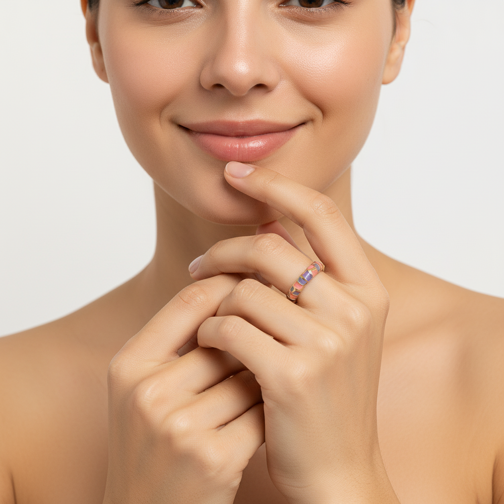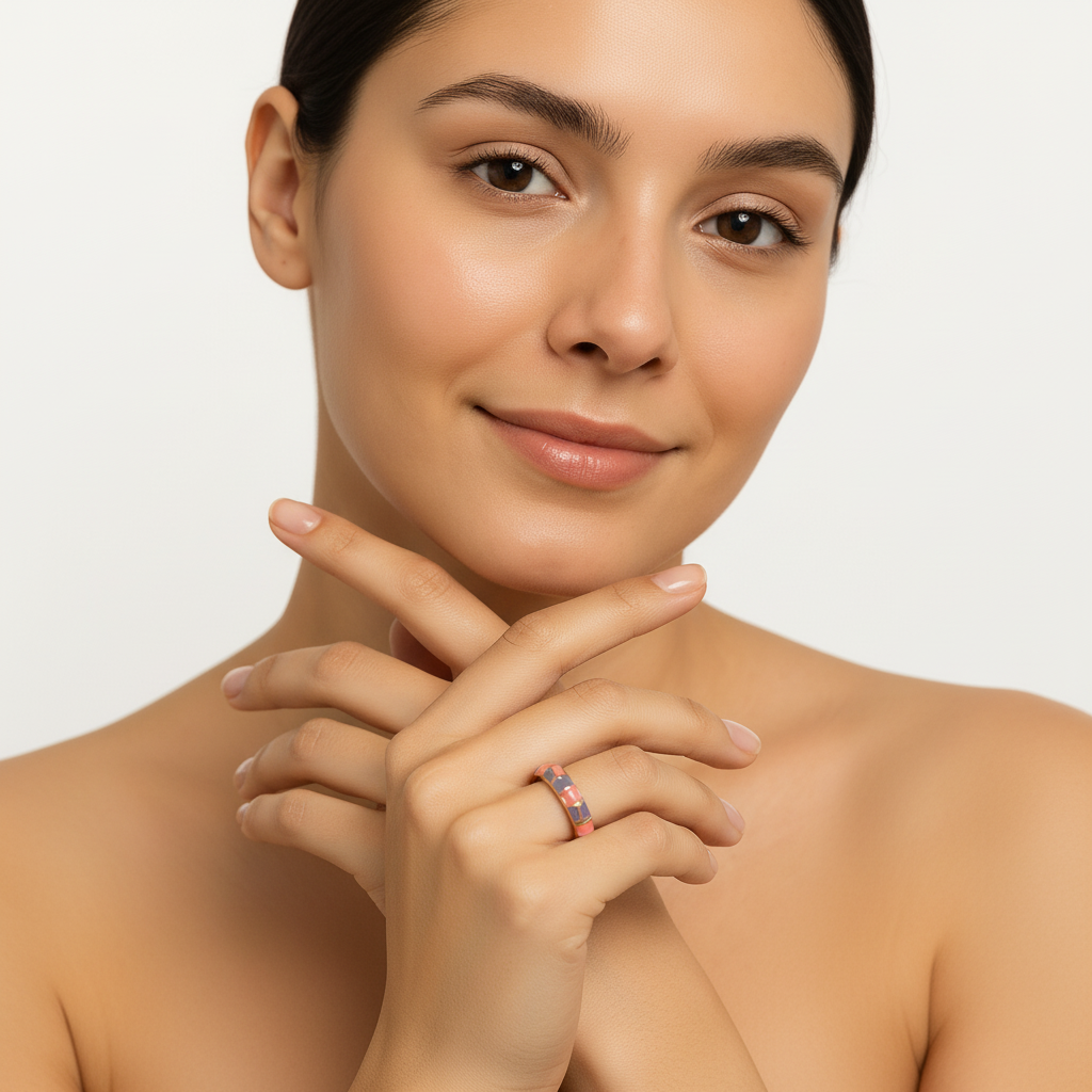 Vibrant and elegant — this coral and purple enamel mosaic ring features gold accents and an adjustable design for a perfect fit. A Lunavia creation that blends color artistry with fine craftsmanship, offering a statement of modern luxury and timeless style.