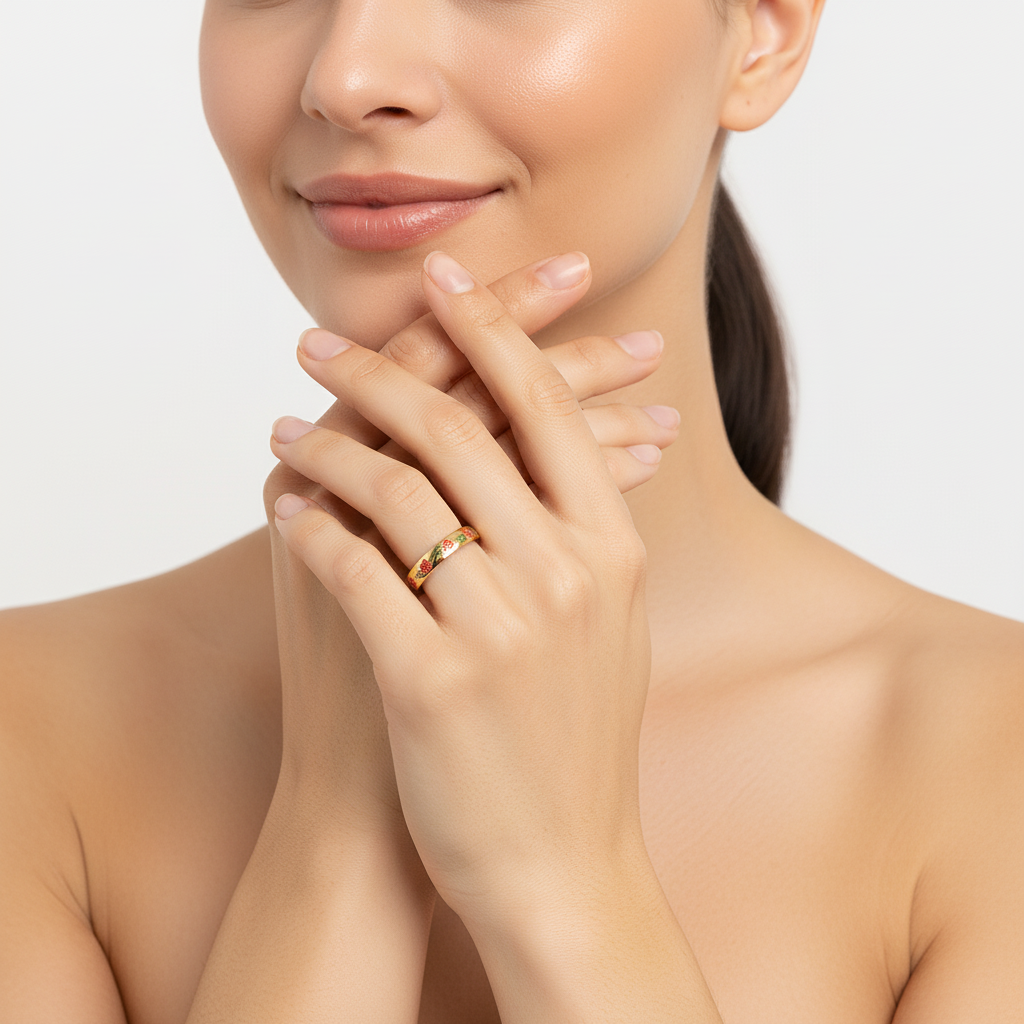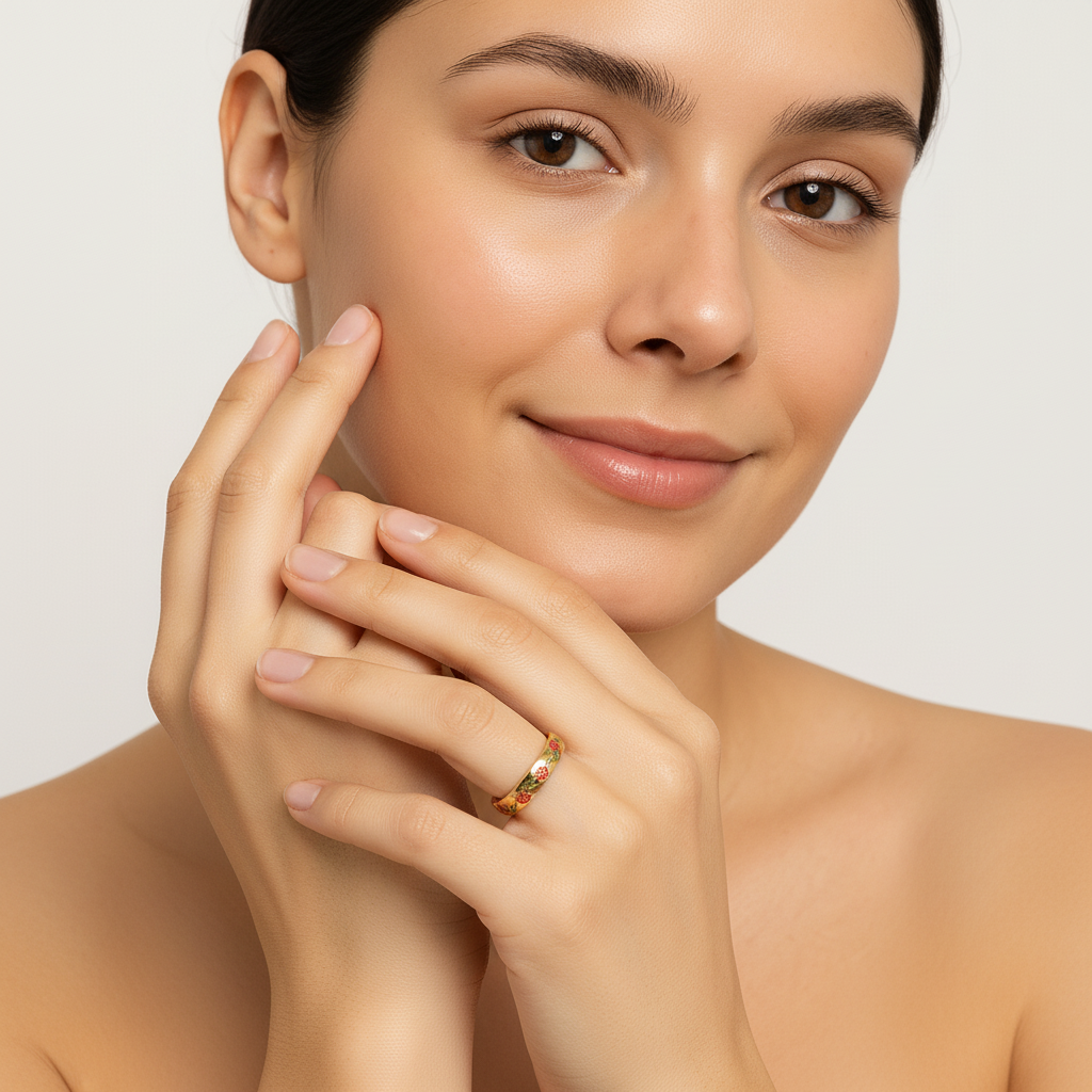 A touch of artistry and tradition — this gold adjustable ring features intricate red floral enamel detailing that adds charm and sophistication. Perfect for everyday elegance or gifting, this Lunavia creation blends timeless craftsmanship with modern minimalism.