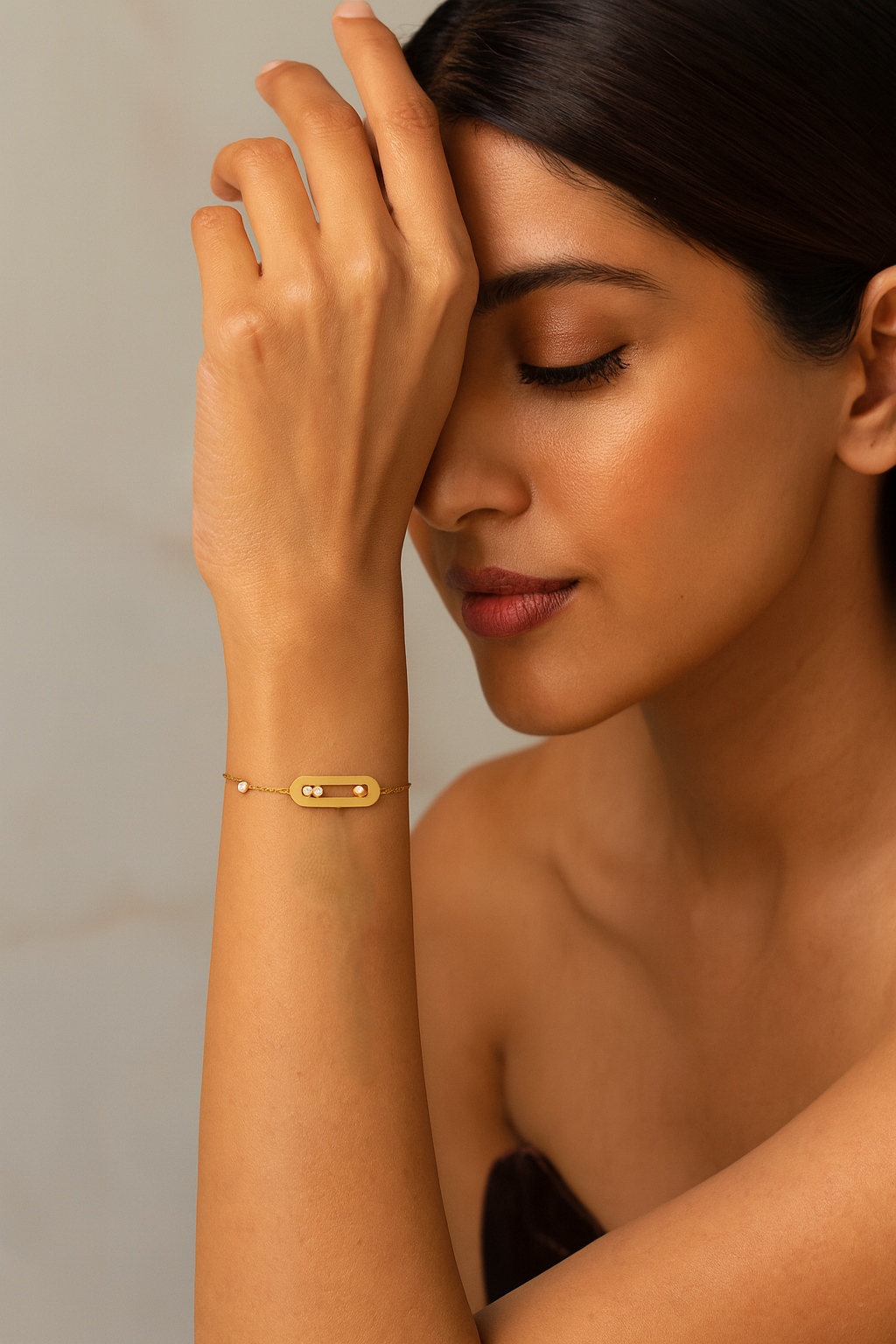 Delicate gold‑tone bracelet featuring an oval open link with three bezel crystals and dotted stations on an adjustable slim chain; perfect for everyday minimal styling, stacking with bangles, or gifting; lightweight, refined, and easy to pair with modern looks.