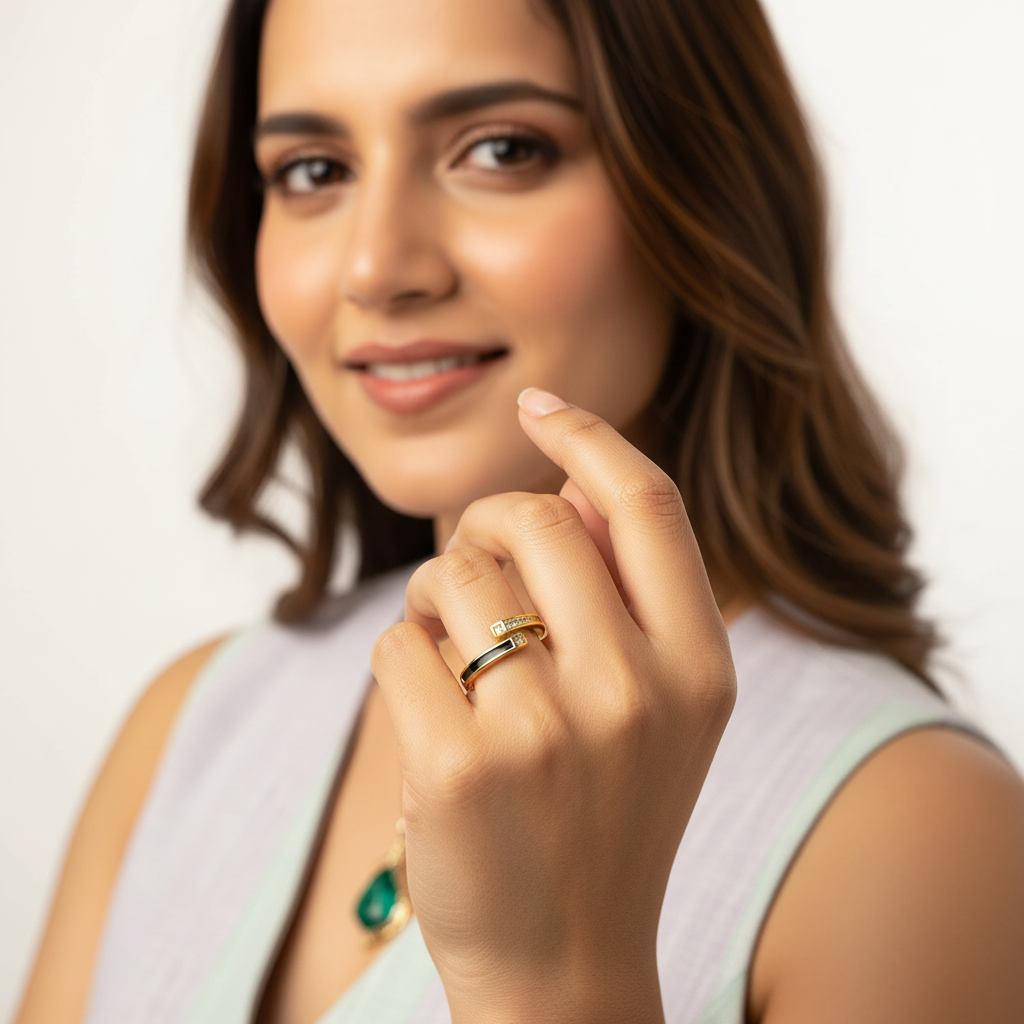 Sleek gold open wrap ring featuring a channel of bright crystals and a smooth black enamel panel. Lightweight comfort and adjustable fit make it perfect for daily wear, parties, and stacks. A chic, nickel‑safe, tarnish‑resistant accent with modern contrast and shine.