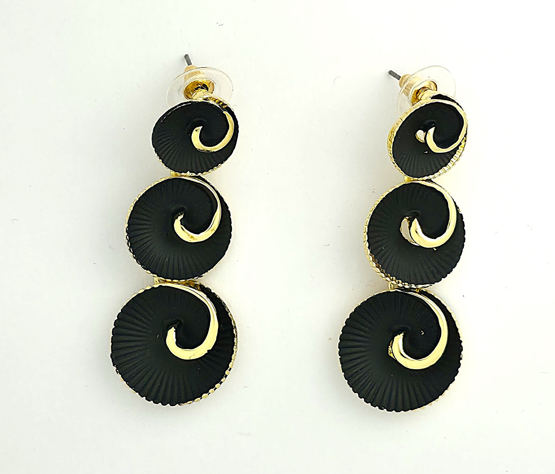 Gold spiral disc drop earrings in sleek black enamel with textured radiating grooves and curved gold swirls. Lightweight posts and a high‑shine finish provide day‑to‑night comfort. A chic, modern statement that elevates monochrome outfits and festive looks instantly