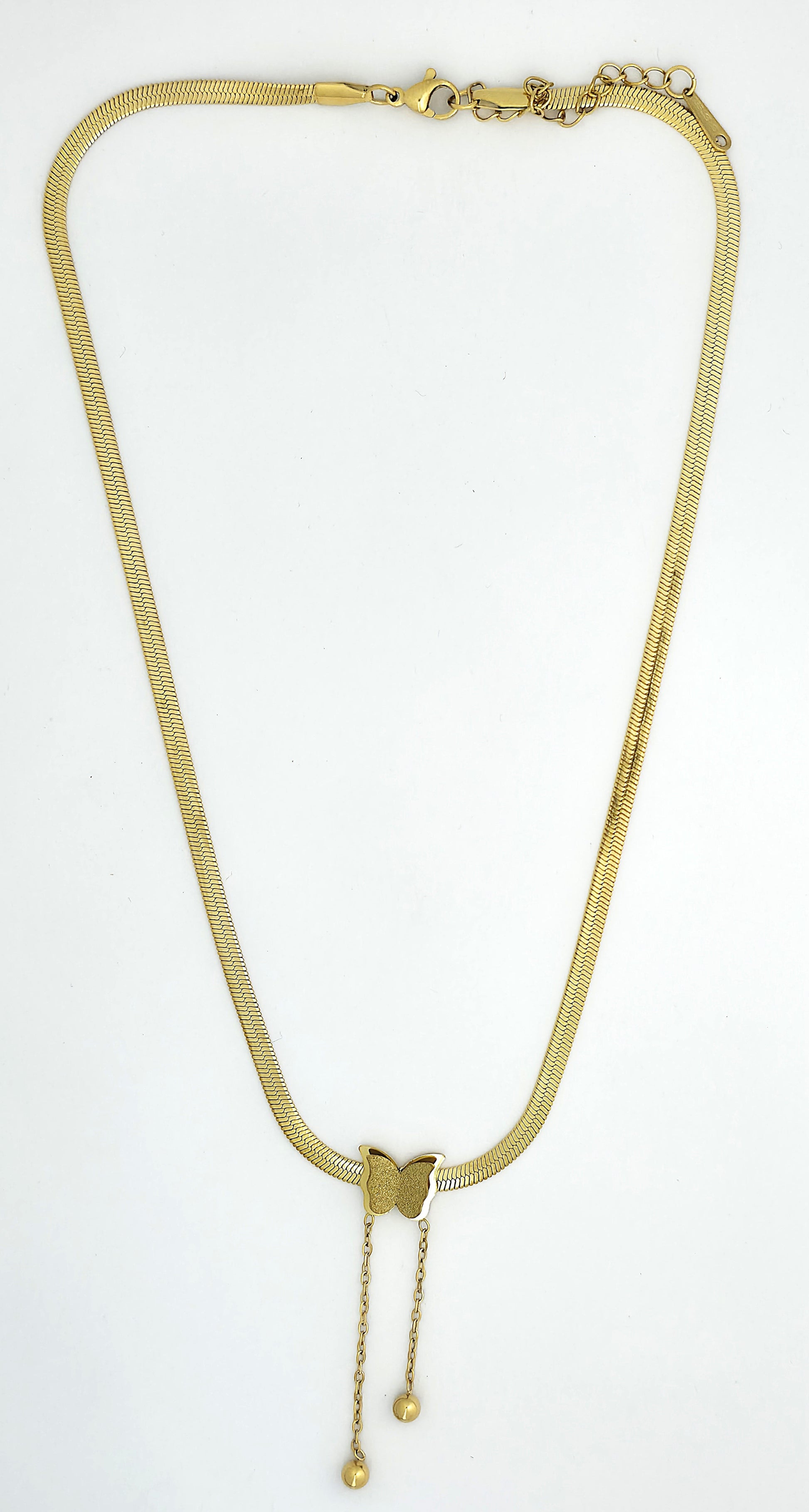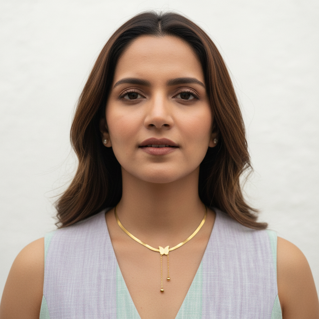 Gold snake chain necklace with butterfly slider and twin dangling charms. Smooth, high‑shine finish and adjustable lariat design offer a custom fit at the collarbone. Nickel‑safe and tarnish‑resistant, it elevates sarees, gowns, and tees with modern feminine polish.
