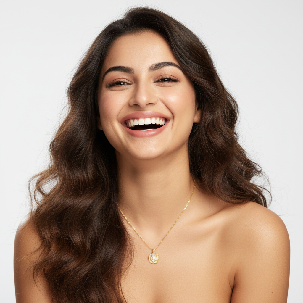 Radiate grace with Lunavia’s Gold Floral Pendant Necklace, featuring a delicate flower design crafted in polished gold with luminous mother-of-pearl petals and a sparkling crystal center. A timeless blend of femininity and luxury — perfect for daily wear or special occasions.