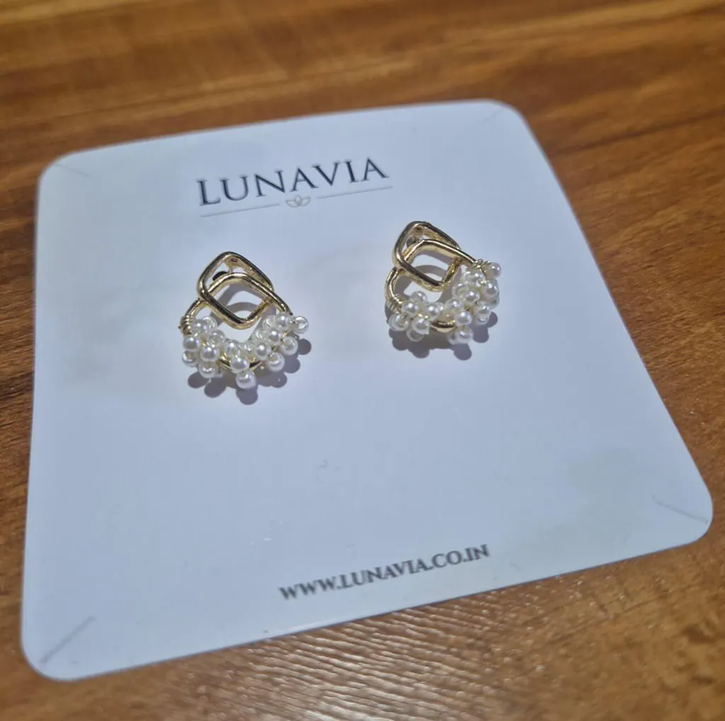 Gold geometric pearl cluster stud earrings featuring interlocking rounded squares and hand‑wired faux pearls. Lightweight yet eye‑catching, they add soft movement and glow. Hypoallergenic, tarnish‑resistant finish makes them ideal for daily wear and thoughtful gifting for her. A graceful daily glow