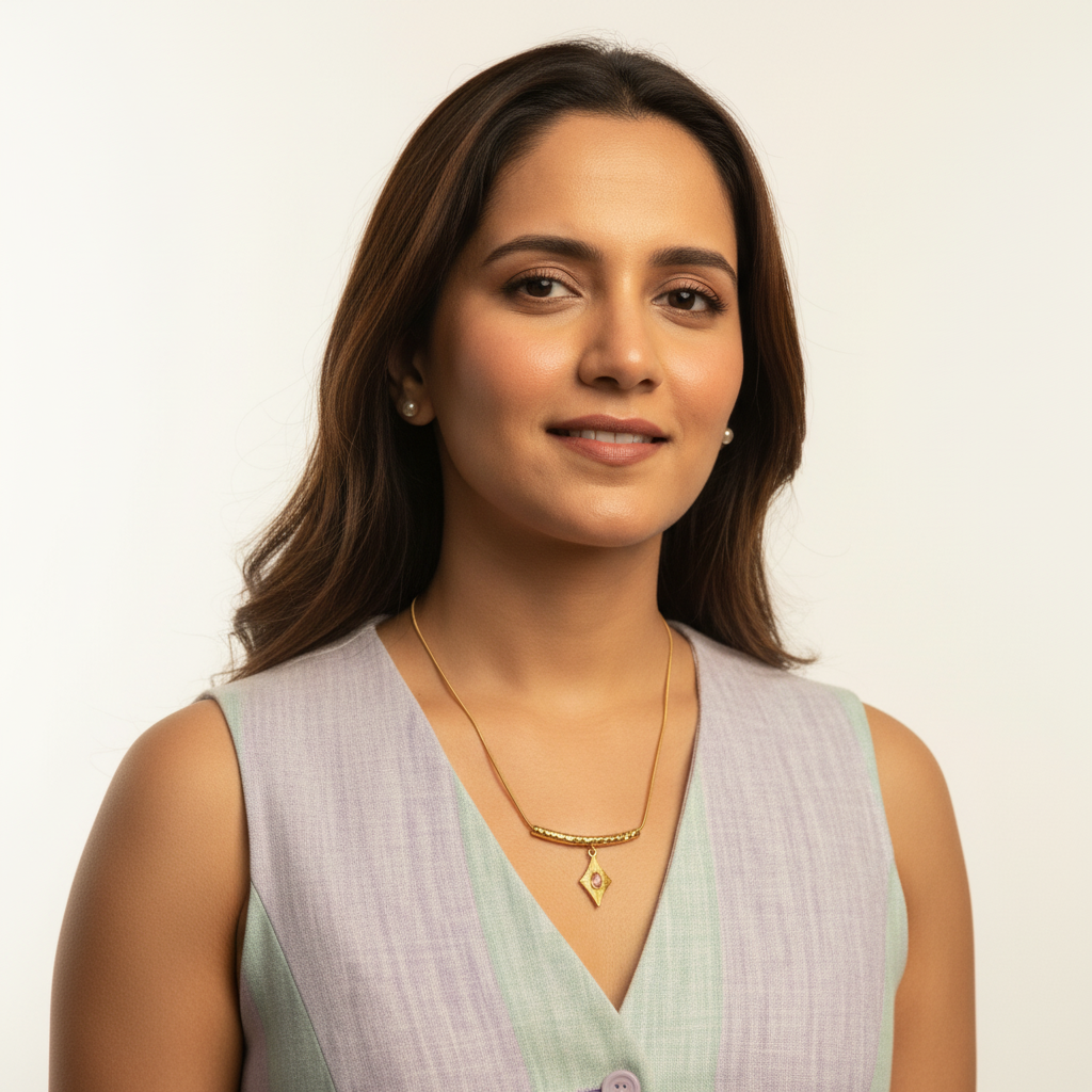 Textured gold necklace featuring a hammered curved bar and a radiant sunburst diamond‑shape charm on a sleek chain; modern, lightweight, and stackable for daily wear or festivities; adjustable, gift‑ready design that adds warm shine and minimalist elegance to any look
