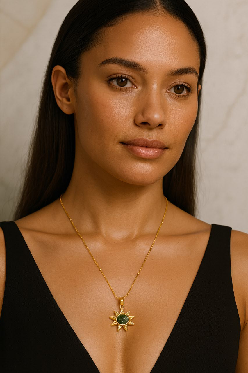 Shine bright with this Gold Sunburst Pendant Necklace featuring a striking green stone center. Crafted in gold vermeil, this celestial-inspired statement necklace blends elegance and boho charm, making it the perfect piece for layering or wearing solo with any outfit.