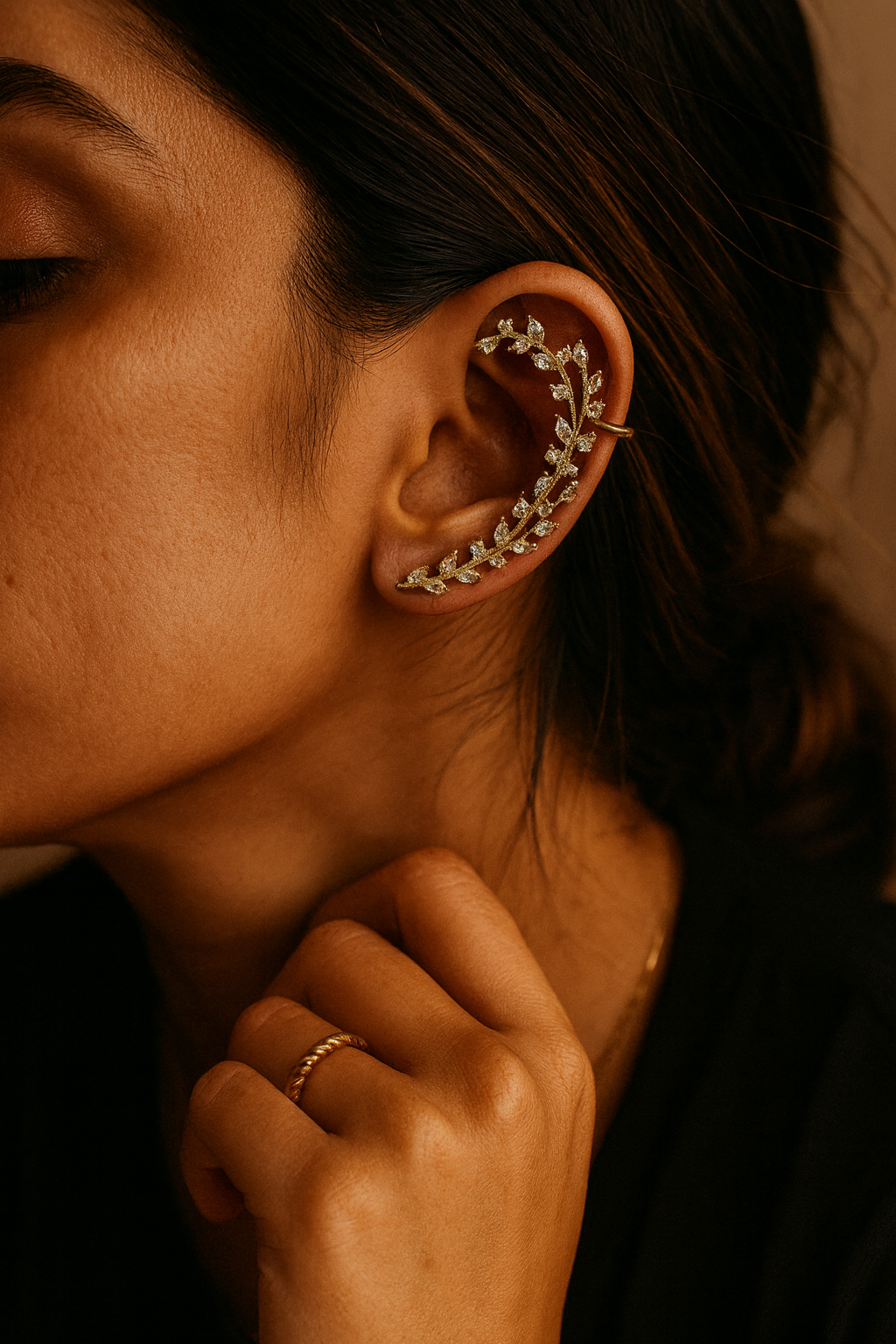 Showcase elegance with a gold vine leaf pearl ear cuff, featuring branching leaves and pearls for a stunning nature statement. Ideal for evening or party wear. Shop designer-inspired ear cuffs—secure checkout, premium quality, and fast shipping for standout style.