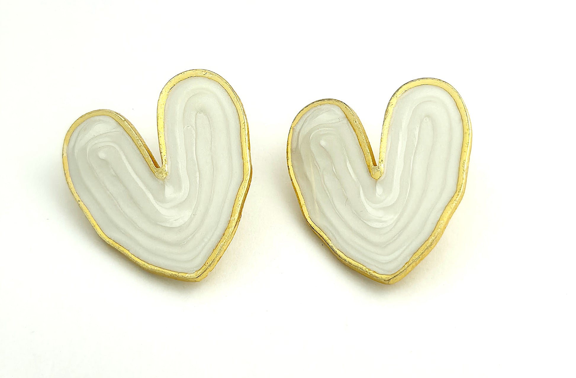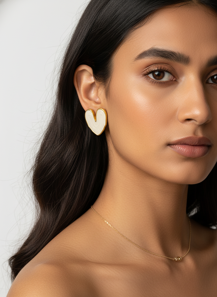 Chic heart stud earrings edged in gold with glossy white enamel and soft, organic contours. Lightweight, nickel‑safe posts offer all‑day comfort and a clean, modern glow. Style them solo or stack with huggies for weddings, work, and weekend looks; a timeless, gift‑ready piece