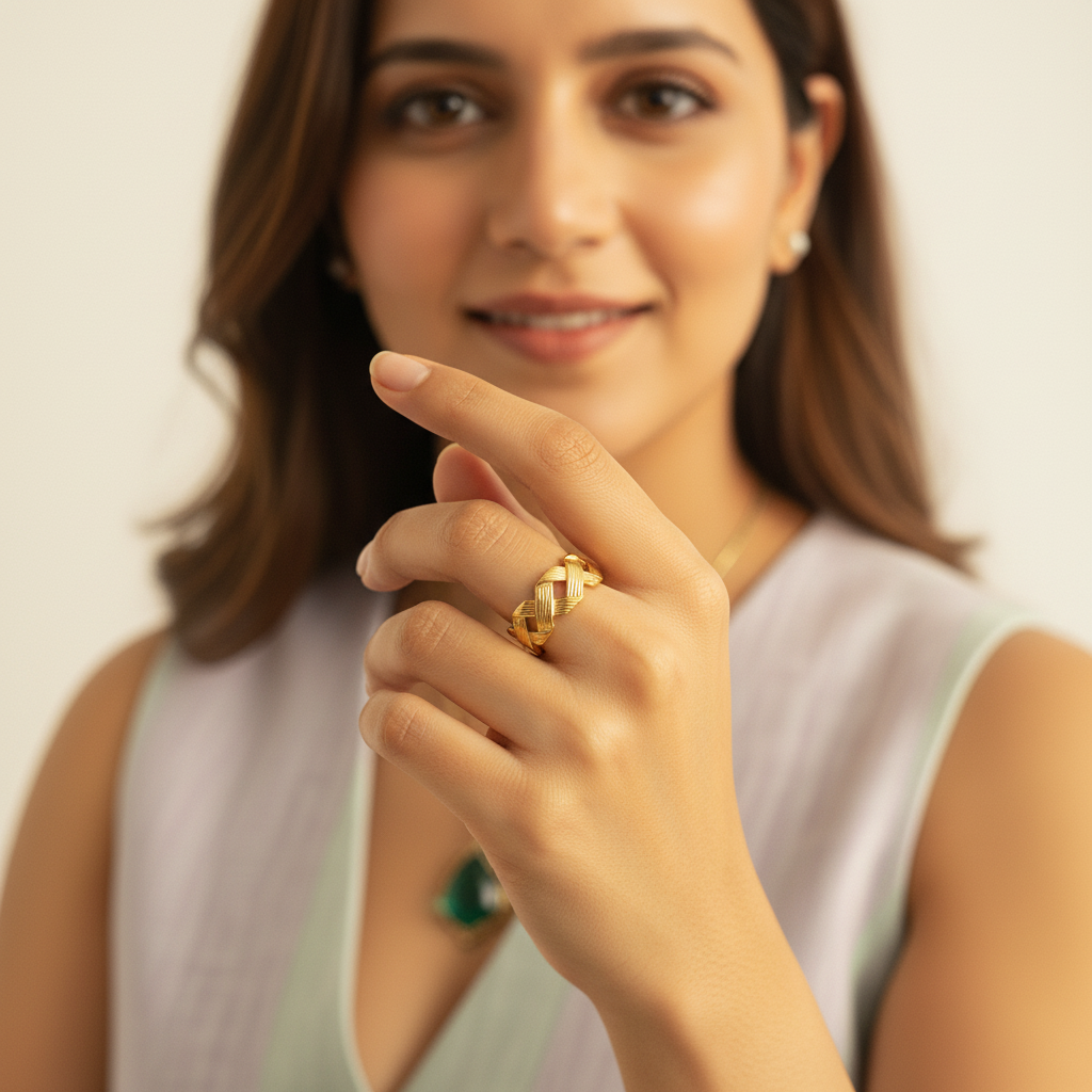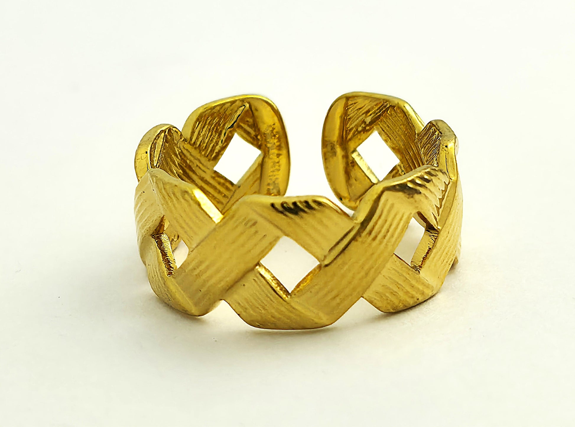 Sculpted gold open ring with a woven lattice pattern and diamond‑shaped cutouts for airy dimension. Adjustable fit, smooth inner band, and tarnish‑resistant finish deliver everyday comfort. A modern statement that stacks with slim bands or shines solo for chic style