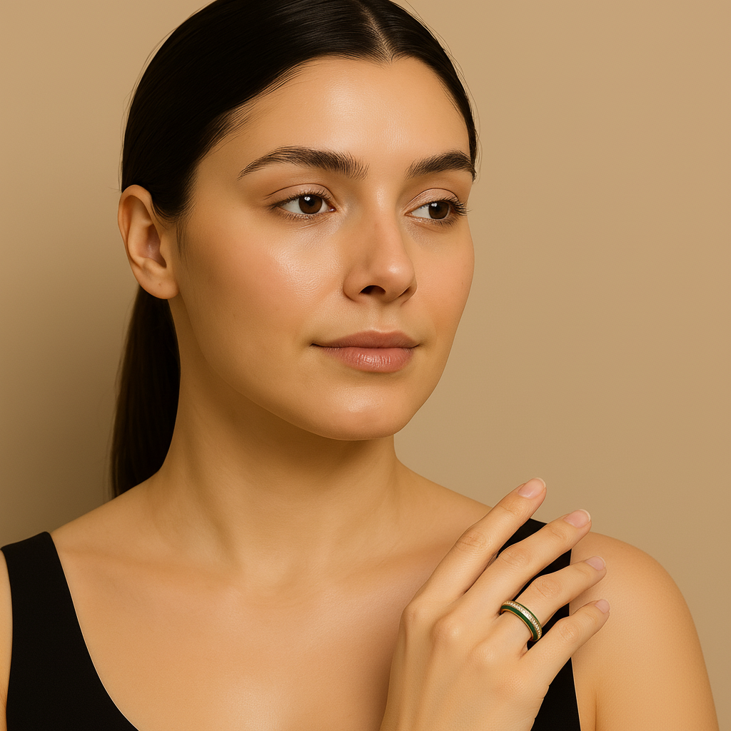 Elegant and radiant — this green enamel and gold adjustable ring features a diamond-studded band that sparkles with every move. A perfect blend of sophistication and modern charm, this Lunavia piece adds a touch of timeless luxury to your everyday style.