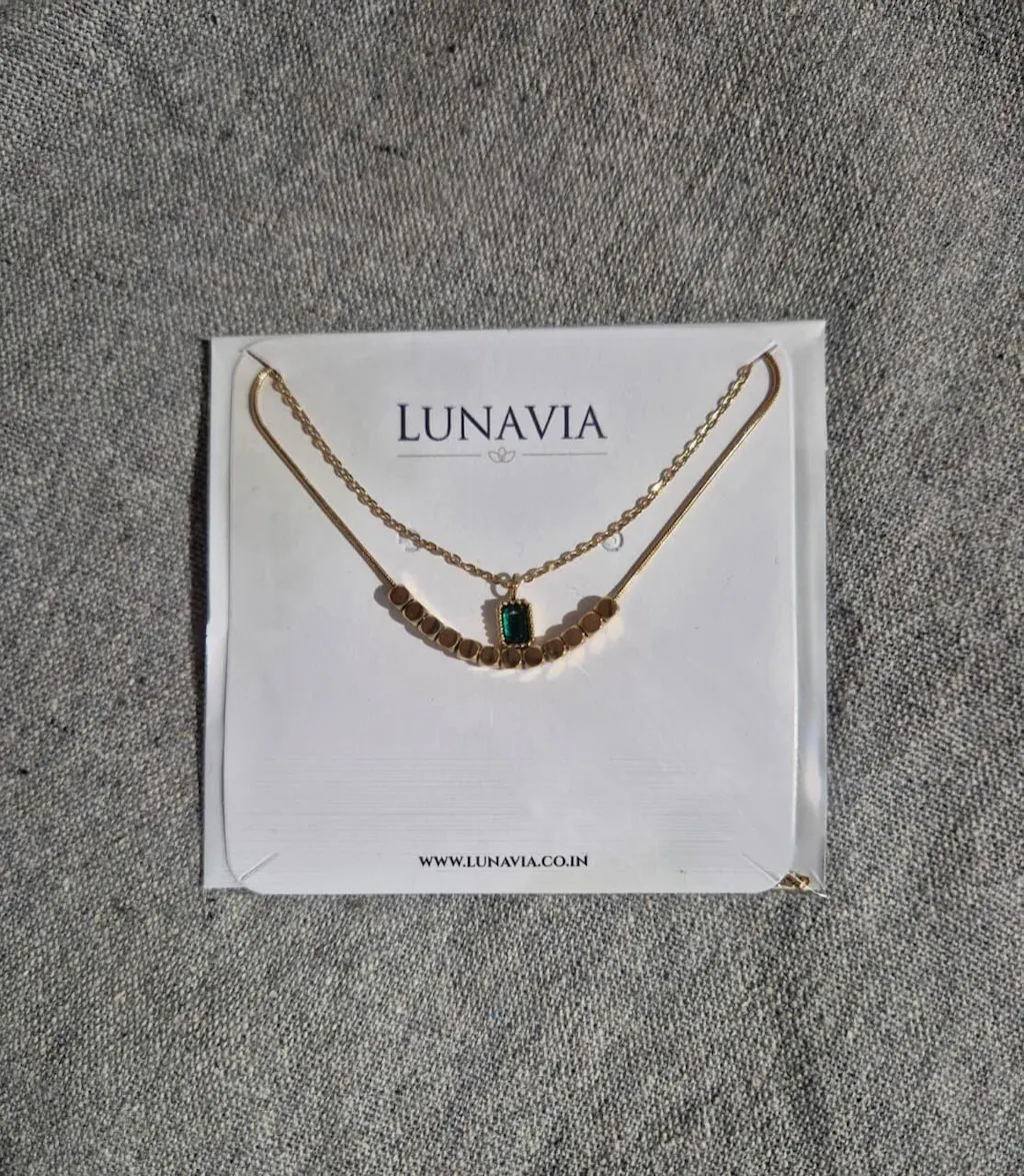 Elevate your look with this layered gold necklace featuring a chic beaded design and a striking green stone pendant. Perfect for parties, festive occasions, or everyday elegance, this versatile necklace blends modern charm with timeless sophistication. A must-have for jewellery lovers.