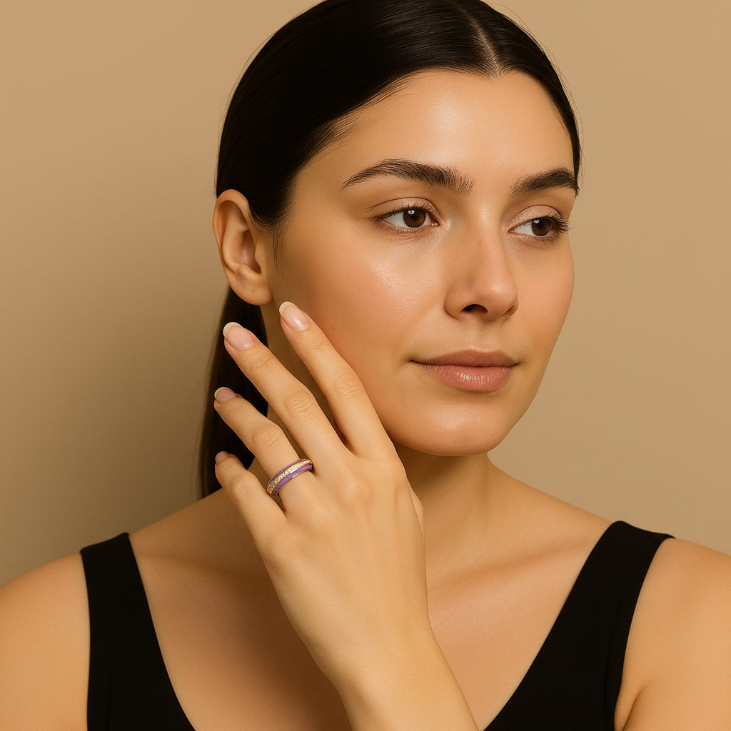 Add a touch of modern charm with this lilac enamel and gold adjustable ring, featuring a delicate diamond-studded band. Designed for everyday elegance, this piece reflects Lunavia’s signature balance of femininity, sophistication, and timeless luxury.