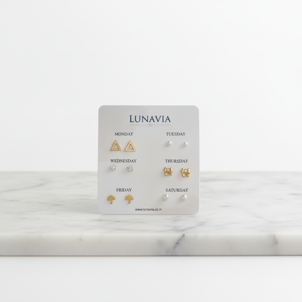 Elevate your everyday style with Lunavia’s Weekly Stud Earrings Set, featuring six beautifully curated pairs designed for each day of the week. This elegant collection includes geometric gold triangle studs, classic pearl studs, sparkling CZ crystal studs, adorable gold bow studs, cute mushroom gold studs, and premium pearl studs for Saturday. Perfect for daily wear, gifting, or building a versatile jewellery wardrobe, Lunavia offers quality, comfort, and timeless charm in every pair.