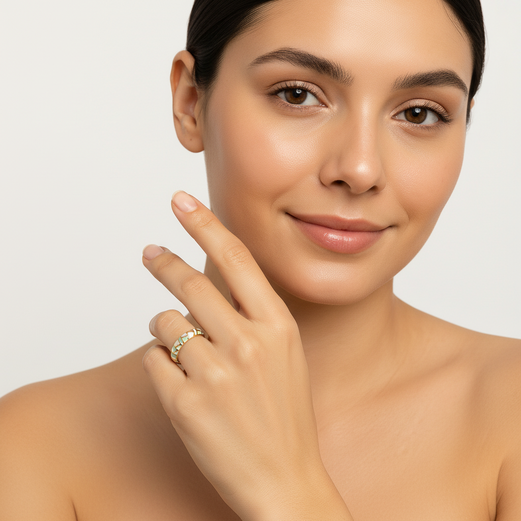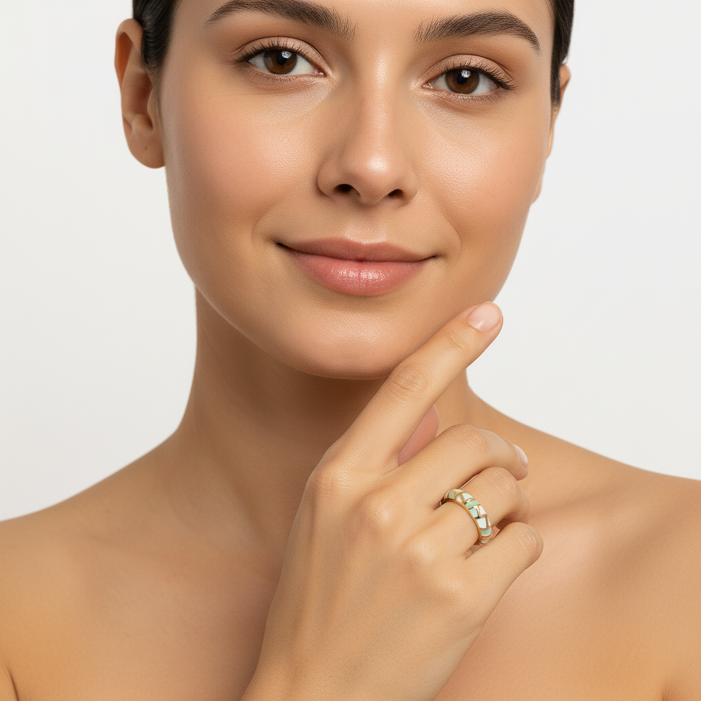 A stunning blend of mint and white enamel artistry, this gold adjustable mosaic ring by Lunavia adds a touch of modern luxury to your look. Lightweight, chic, and versatile — perfect for elevating everyday style with elegant sophistication.
