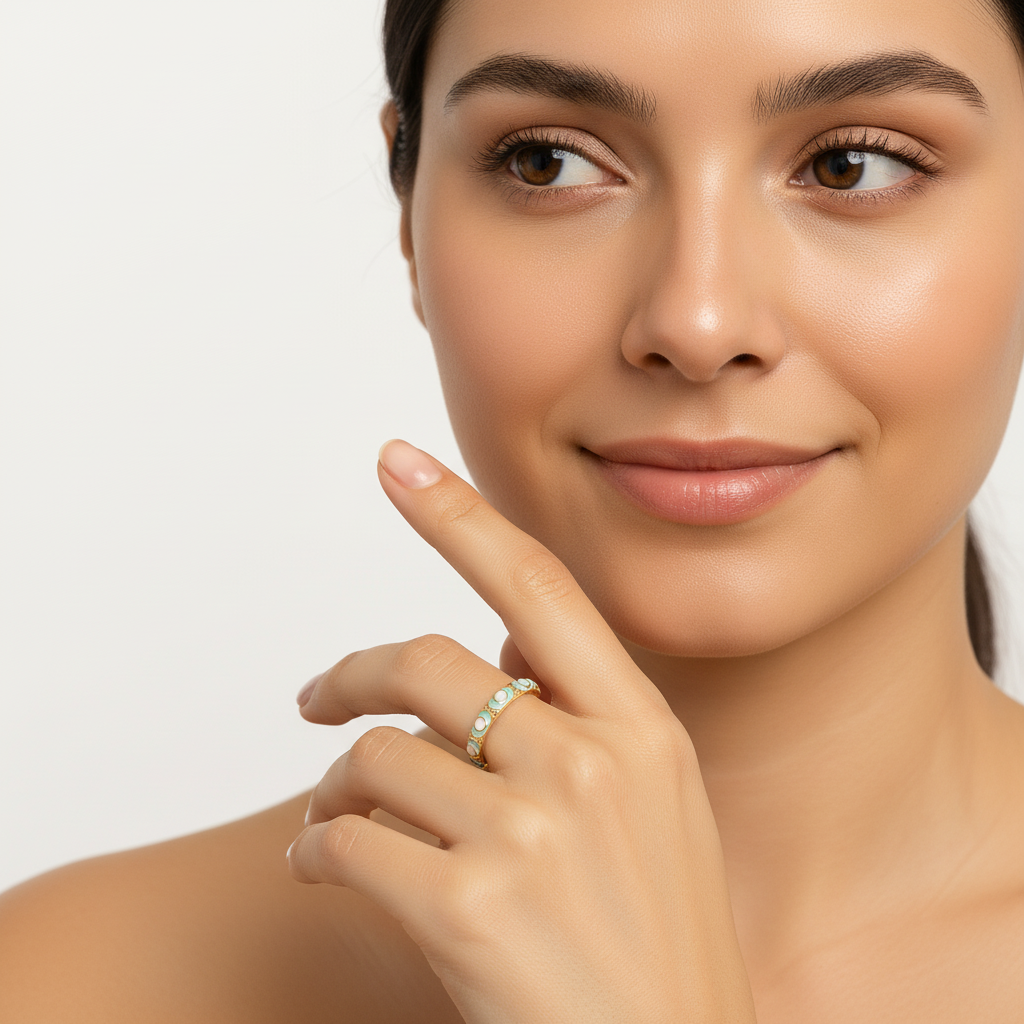 Delicate yet bold — this mint and white enamel ring with gold detailing by Lunavia brings effortless sophistication to any look. Its adjustable fit and handcrafted shine make it a perfect blend of everyday charm and timeless luxury. Ideal for stacking or wearing solo.