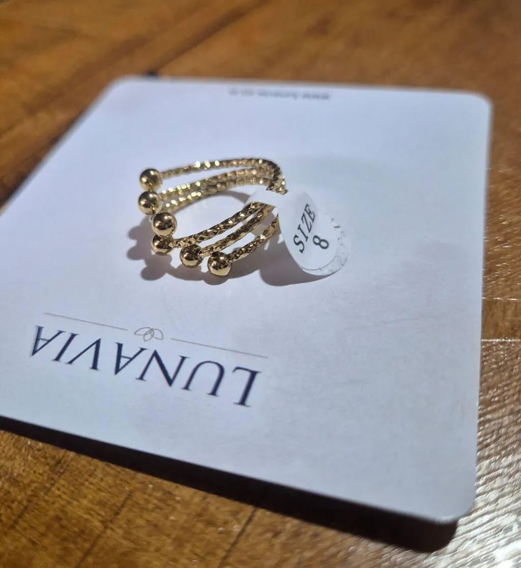 Elevate any stack with a multi strand beaded orbit ring featuring braided bands and polished gold spheres. Adjustable open design offers a comfortable fit, while the glossy finish adds luxe texture. Wear solo for sculptural style or layer with slim bands for impact.