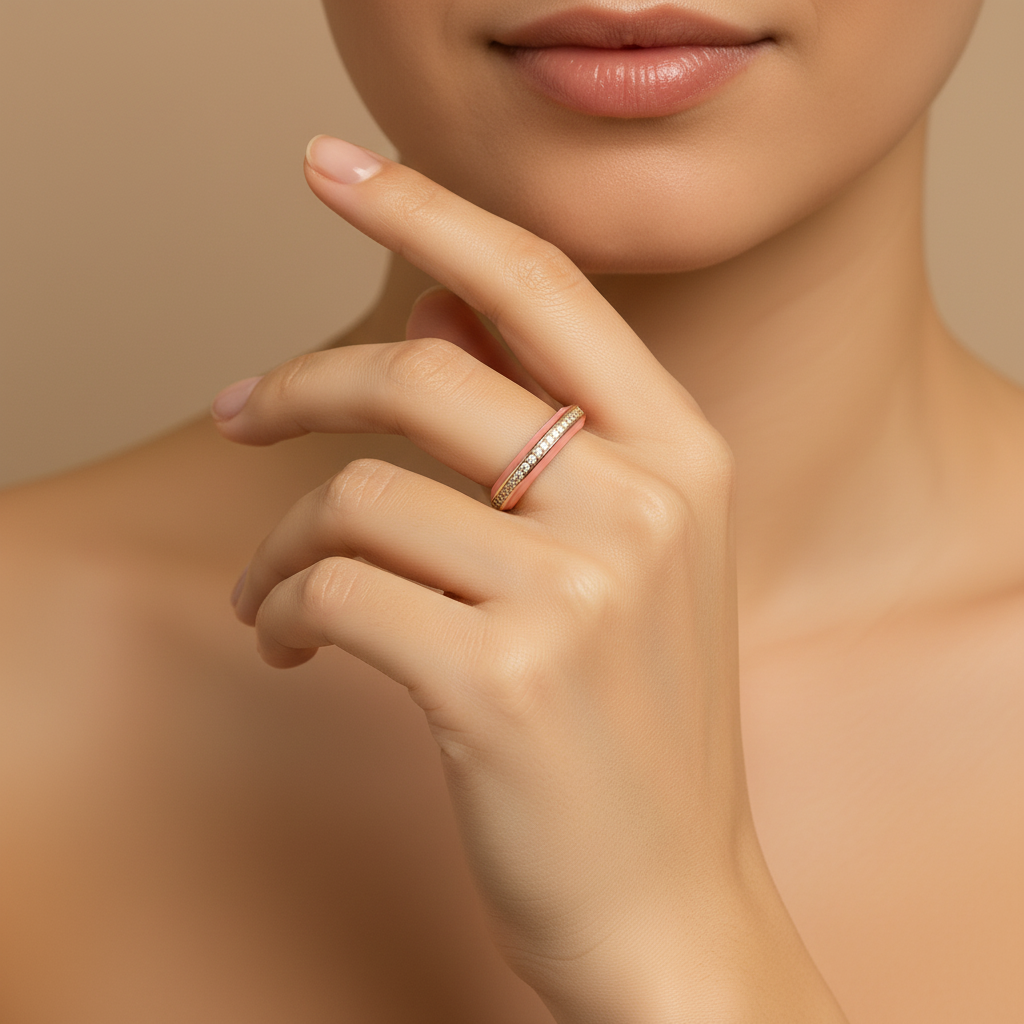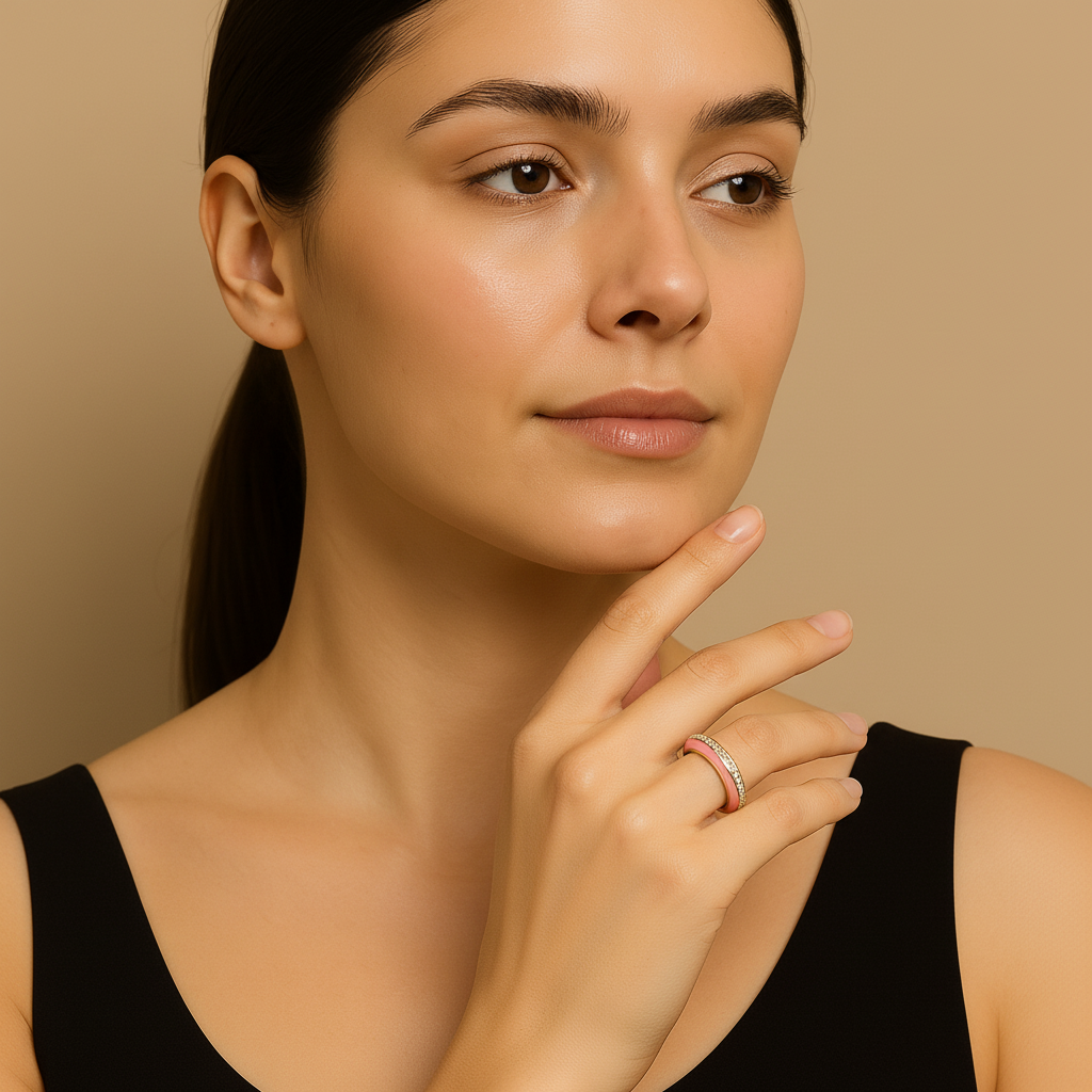Embrace soft elegance with this pink enamel and gold adjustable ring, adorned with a shimmering diamond-studded band. A perfect blend of femininity and luxury, this timeless Lunavia design adds a subtle glow and refined charm to your everyday style.