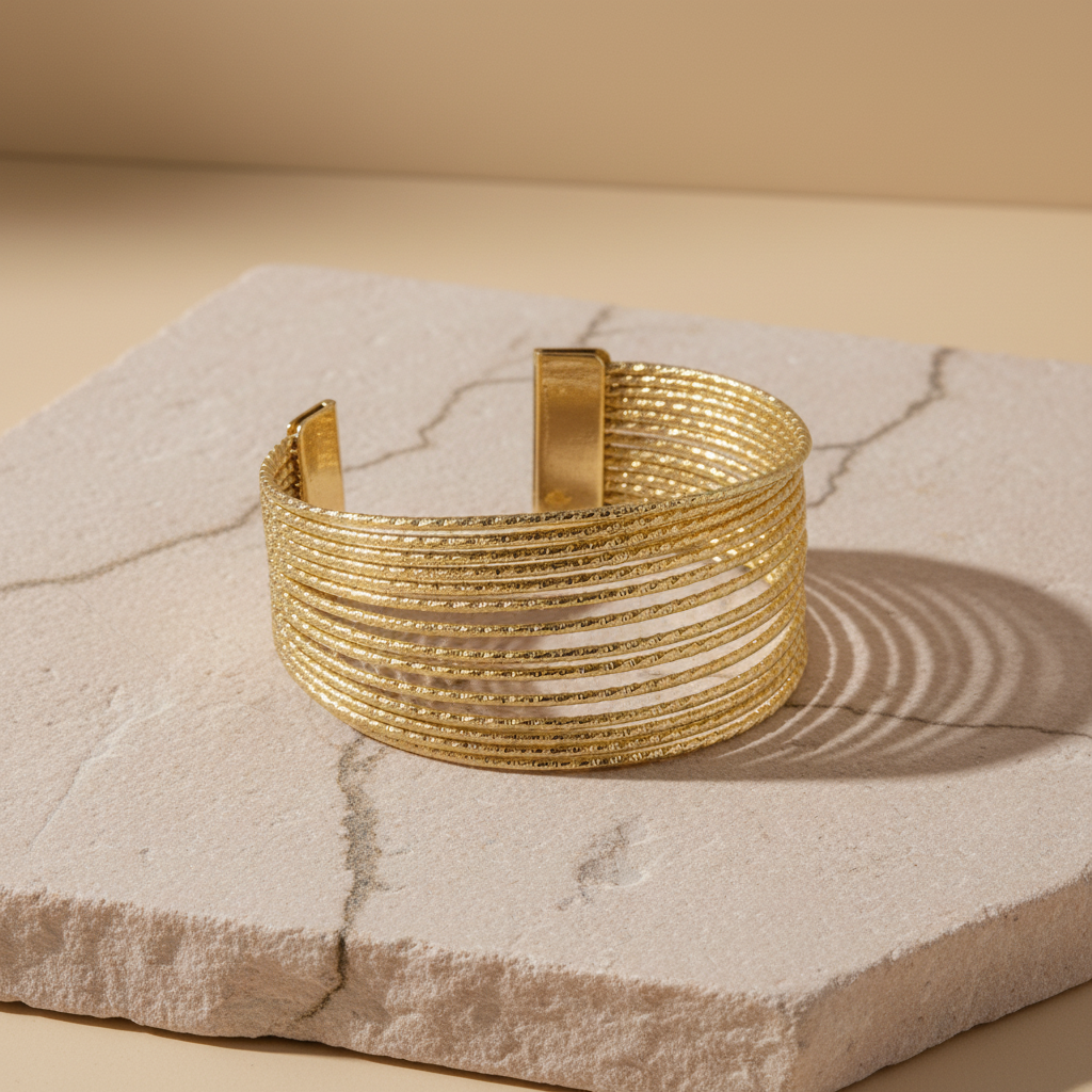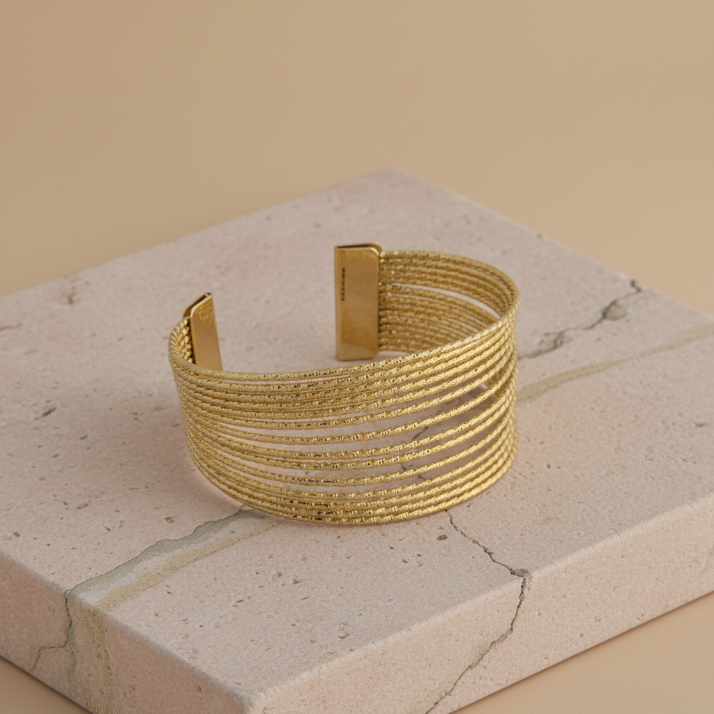 Make a bold yet refined statement with Lunavia’s Textured Gold Wire Cuff Bracelet. Designed with multiple parallel strands in a rich gold finish, this open bangle blends modern artistry and timeless grace — a perfect accessory for both casual sophistication and elegant evening wear.