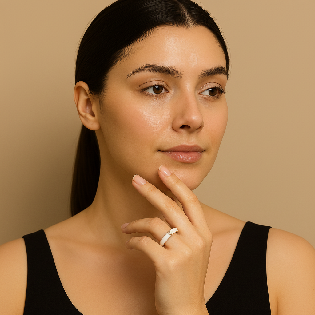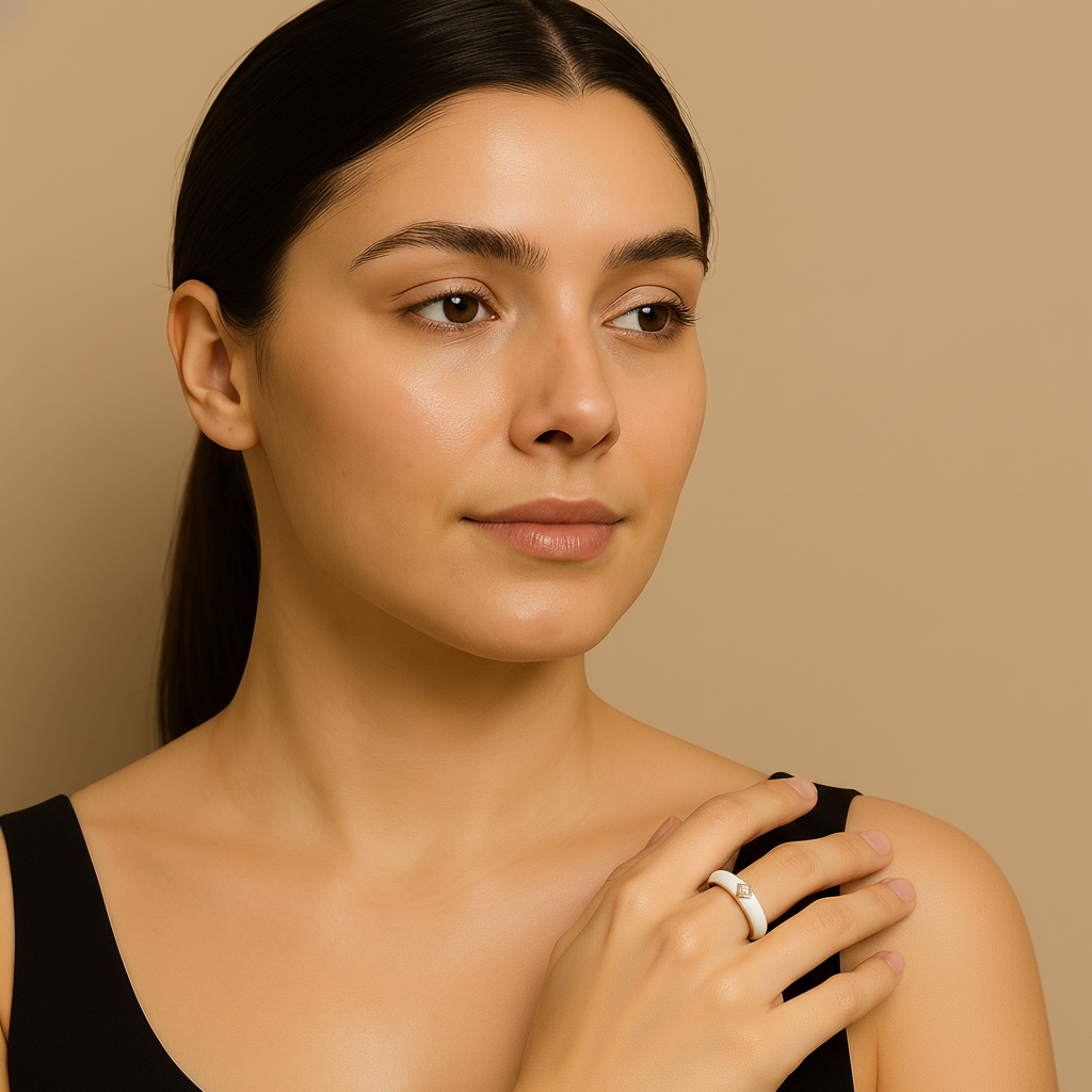 Refined and timeless — this white enamel and gold adjustable ring features a delicate diamond accent that adds effortless sophistication. Crafted for modern elegance, it embodies Lunavia’s signature style — minimal, graceful, and designed for everyday luxury.